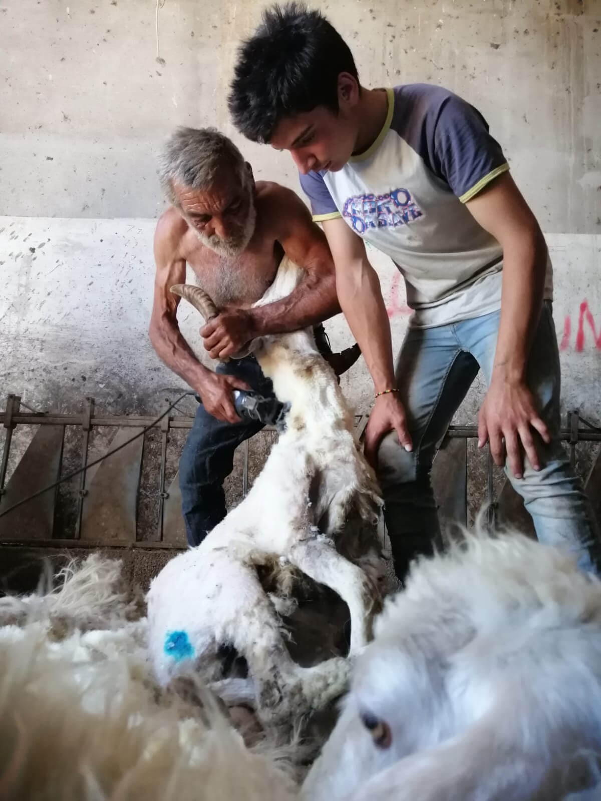 Shearing is a slowly disappearing collective event. Friends, family and pastoralist colleagues are invited to help. Young people tie the sheep so they are ready to be sheared and are also in charge of collecting the wool. Adult pastoralists shear for four to five hours in a row for two or three days. After shearing everyone enjoys a nice lunch and spends time together.